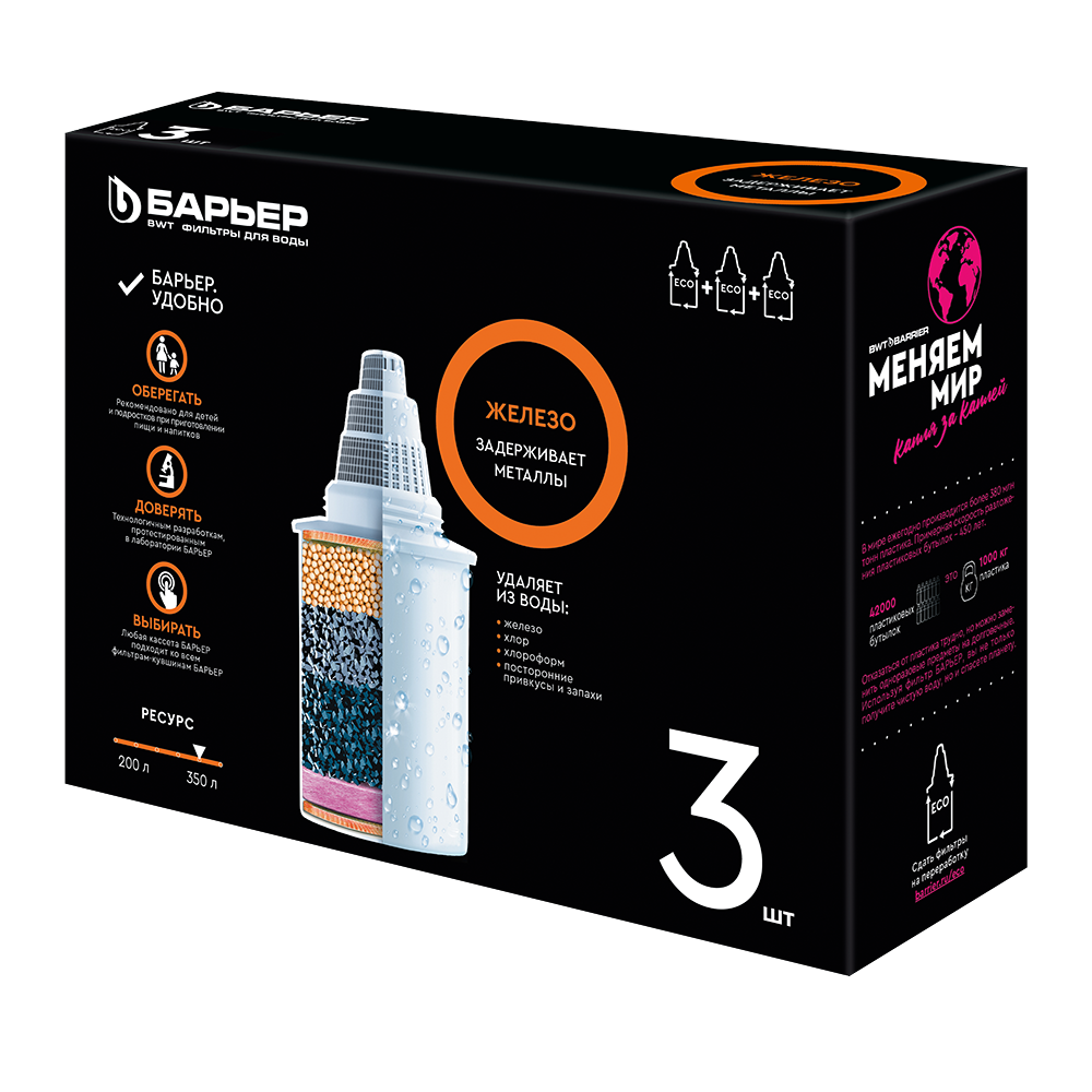 Одна кассета БАРЬЕР способна заменить несколько сотен пластиковых бутылок. По окончании ресурса кассеты можно сдать на переработку в пунктах приема