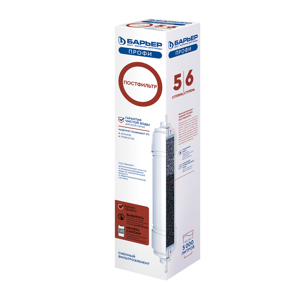 БАРЬЕР ПРОФИ ОСМО ПостФильтр – картридж финишной очистки для систем обратного осмоса БАРЬЕР ПРОФИ Осмо 100, БАРЬЕР ПРОФИ Осмо 100 М, БАРЬЕР ПРОФИ Осмо 100 Boost, ПРОФИ Осмо 100 Boost М. В системах без минерализатора используется в качестве пятой ступени, в комплектации с минерализатором становится шестой ступенью. Картридж устраняет специфические запахи и привкусы, обеспечивает кондиционирование воды после накопительной емкости.