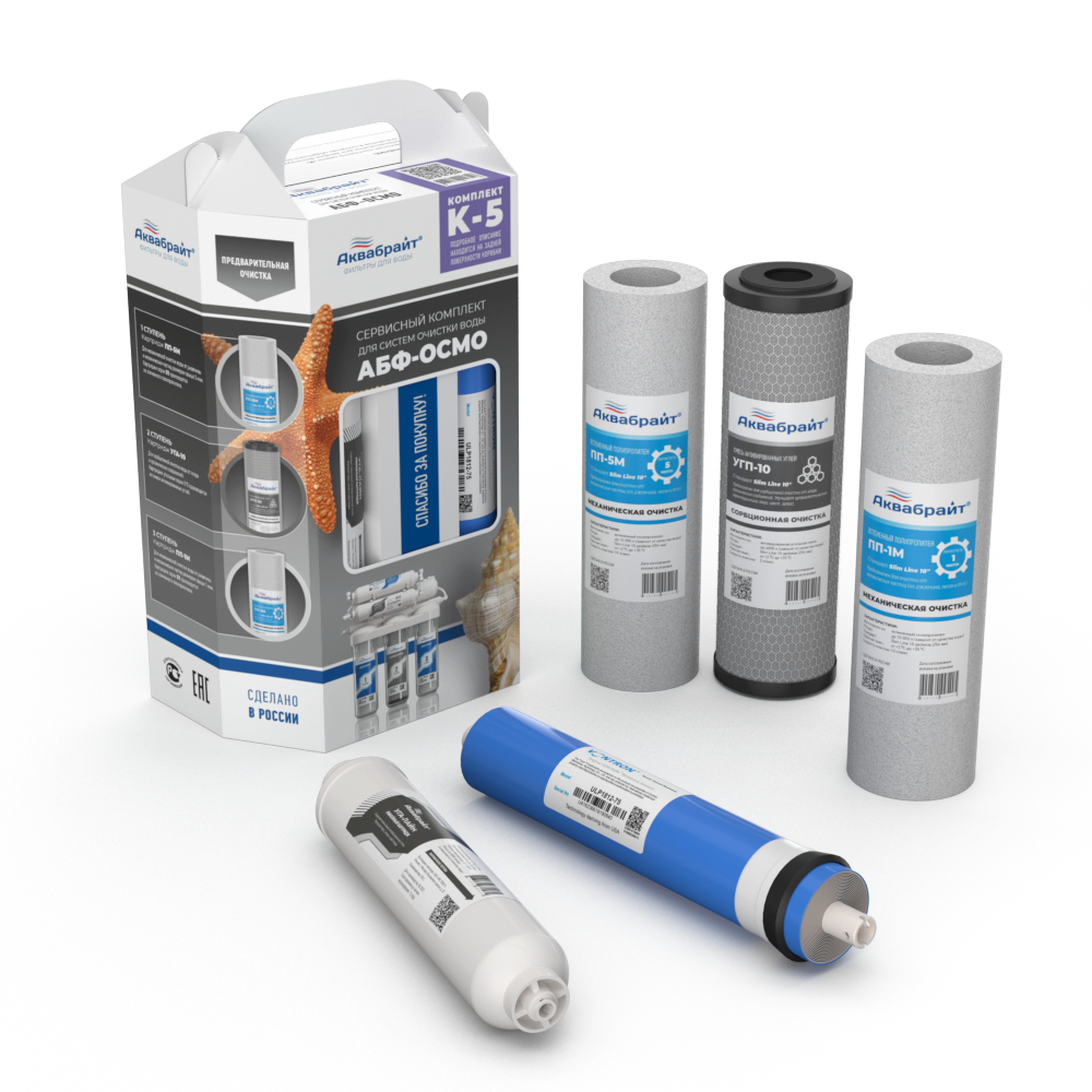 Комплект картриджей Аквабрай К-5 с мембраной для очистки воды. Предназначен для установки в питьевые системы серии АБФ-ОСМО-5 под кухонную мойку, а также подойдёт для любых аналогичных систем обратного осмоса.