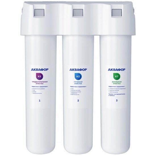 Три картриджа последовательно очищают воду от видимых механических примесей и растворенных вредных веществ. Блок предварительной очистки К3 задерживает частицы размером от 5 микрон, модуль глубокой очистки К2 – от 3 микрон. Третий модуль К7 обеспечивает финишную очистку от частиц до 0,8 микрон (что в 125 раз тоньше человеческого волоса). Карбонблок с Акваленом захватывает и надежно задерживает тяжелые металлы и другие опасные примеси, которые чаще всего встречаются в водопроводной воде.