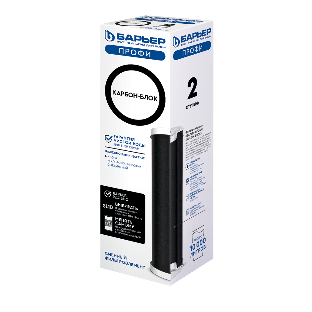 БАРЬЕР ПРОФИ Карбон-блок - картридж для доочистки воды от хлора и хлорорганики, фенольных соединений и механических примесей. Улучшает вкусовые качества и запах воды. Используется в качестве второй ступени в фильтре БАРЬЕР ПРОФИ Стандарт и в качестве четвертой ступени в фильтре ПРОФИ Осмо 600.
